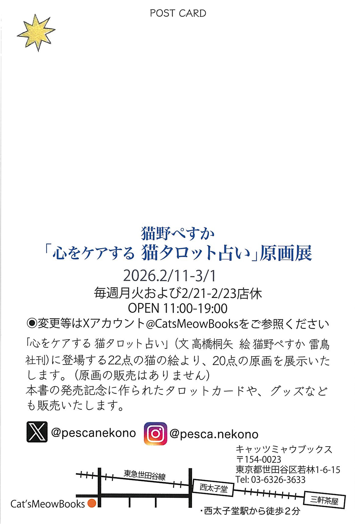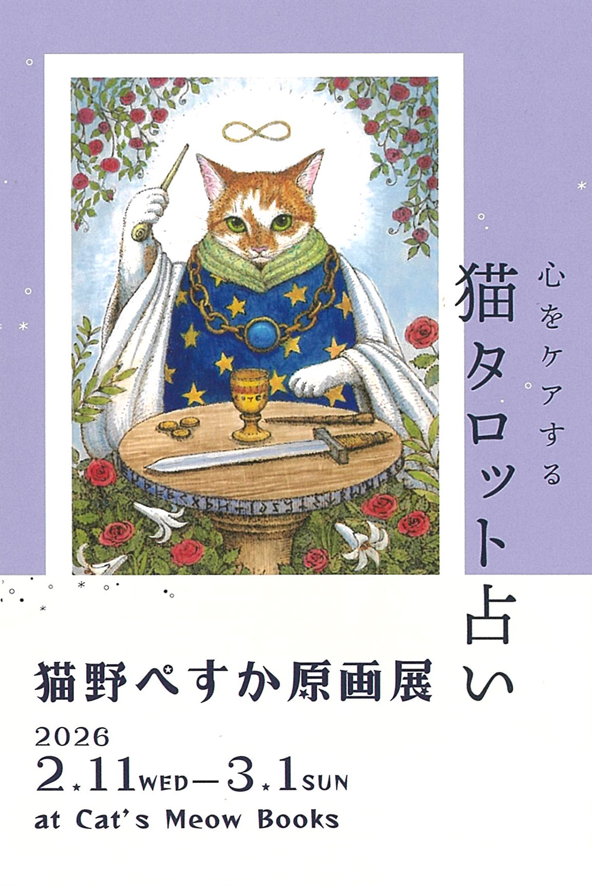 ウッドバーニングとペイントを組み合わせて作品を制作する 猫野ぺすかさんの原画展です。 「心をケアする 猫タロット占い」(文 高橋桐矢 絵 猫野ぺすか 雷鳥社刊)より、20点の原画を展示いたします。本書の発売記念に作られたタロットカードやグッズ販売されます。
